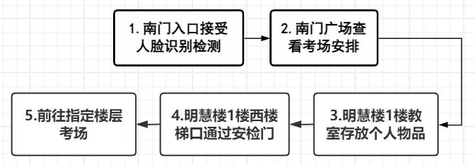 进入考点请依据以下流程,以顺利及时抵达考场,相应区域已在考点平面图中标示: